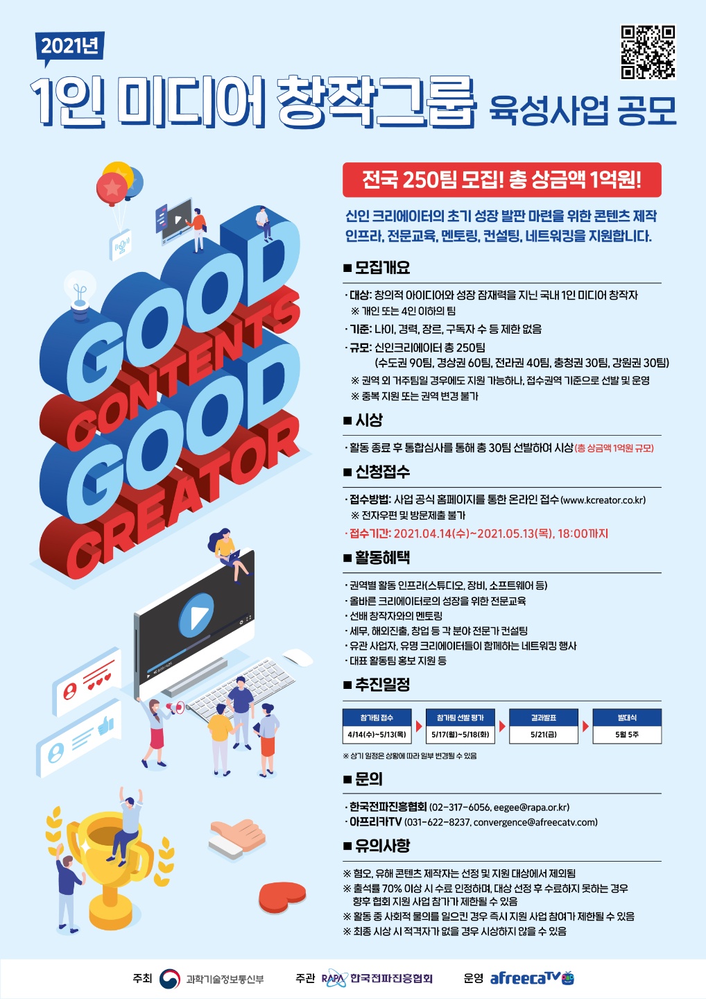 과학기술정보통신부와 한국전파진흥협회는 미디어 분야 신성장동력으로서 1인 미디어 산업을 활성화하기 위해 전국 1인 미디어 창작자를 대상으로 1인 미디어 창작그룹 육성사업을 추진하고 있습니다. 초기 활동 지원을 통해 산업을 선도할 창작자를 모집하오니, 많은 관심과 참여 부탁드립니다.