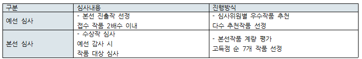 - 수상작으로 선정된 작품 중 수상 포기 및 결격 사유가 발생할 경우 차순위 작품을 선정함