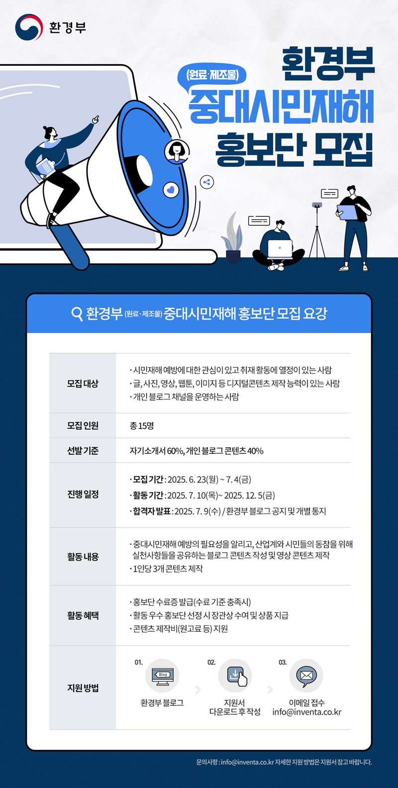 환경부 블로그 내 지원서 양식을 다운로드하여 작성 후 info@inventa.co.kr 로 제출