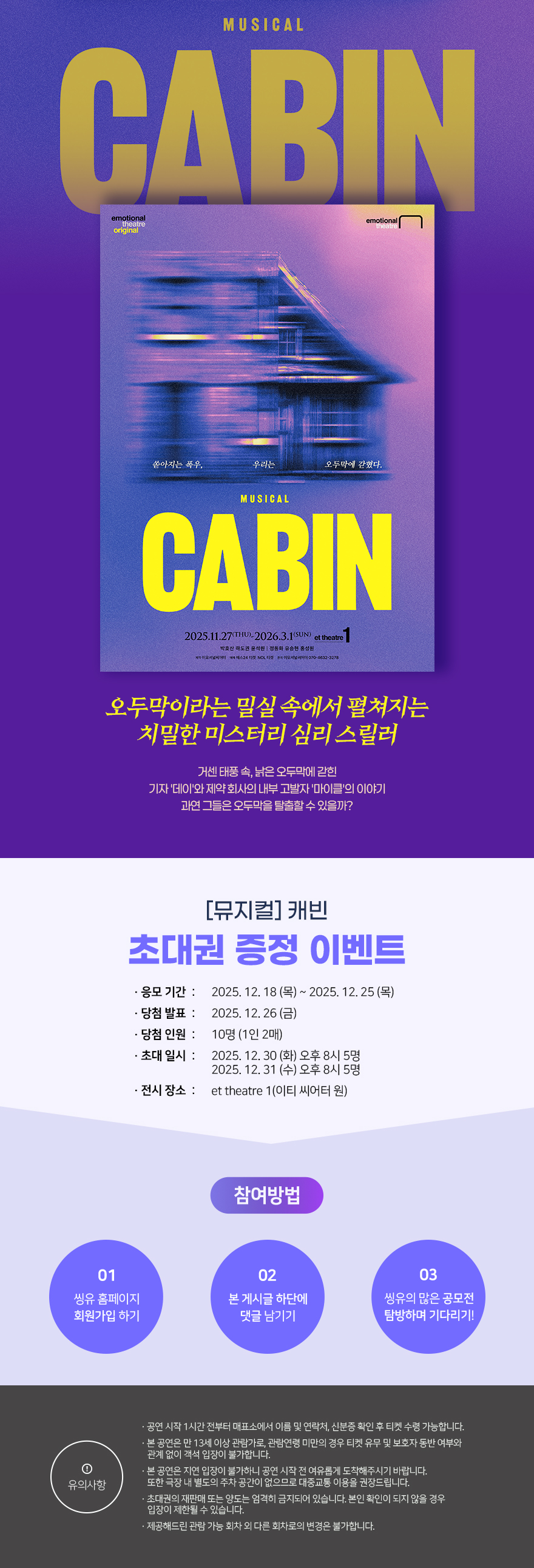 추첨을 통해 뮤지컬 <캐빈> 공연에 초대합니다.