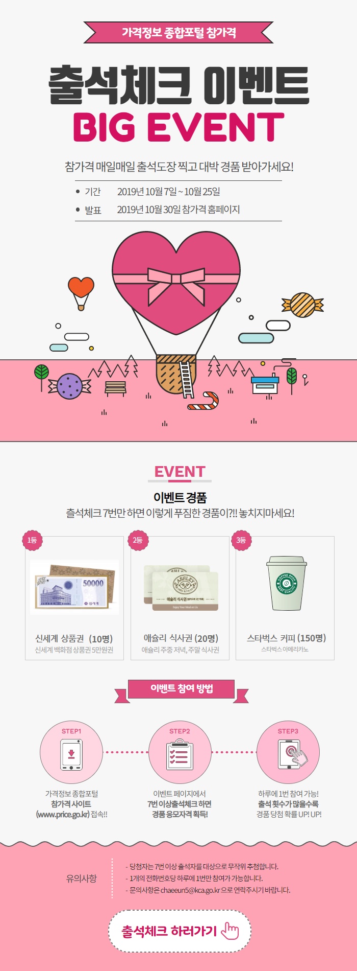참가격 사이트(http://www.price.go.kr) 가격뉴스-이벤트/공모전 메뉴를 통해 참여 하나. 참가격 이벤트 게시판 '참가격 출석체크 투표 이벤트' 에서 매일매일 출석체크 하기! 둘. 7번 이상 출석체크 하면 응모자격 획득! 셋. 응모 횟수가 많으면 많을 수록 경품 당첨 확률 UP! UP!