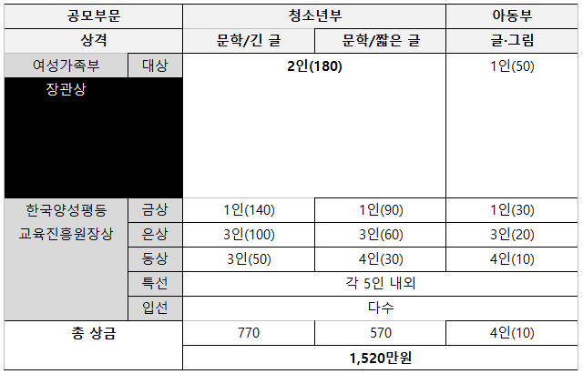 ※ 여성가족부 장관상(대상)의 경우, 긴글/ 짧은글 구분 없이 총2인 선발 예정