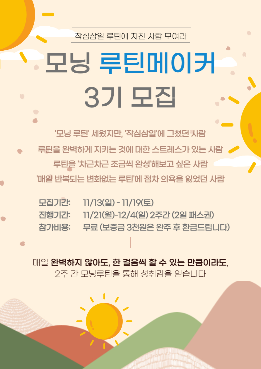 진짜 모닝 루틴을 만들어 갈 루틴 메이커 3기를 모집합니다.