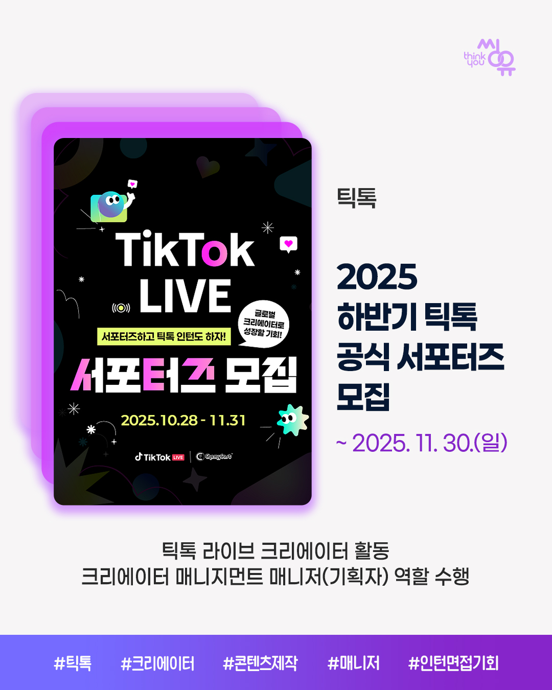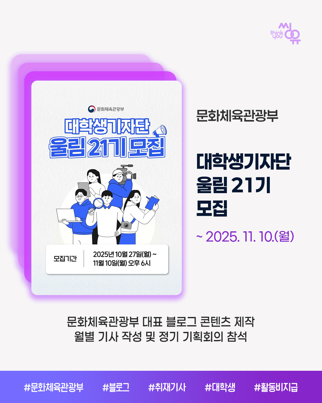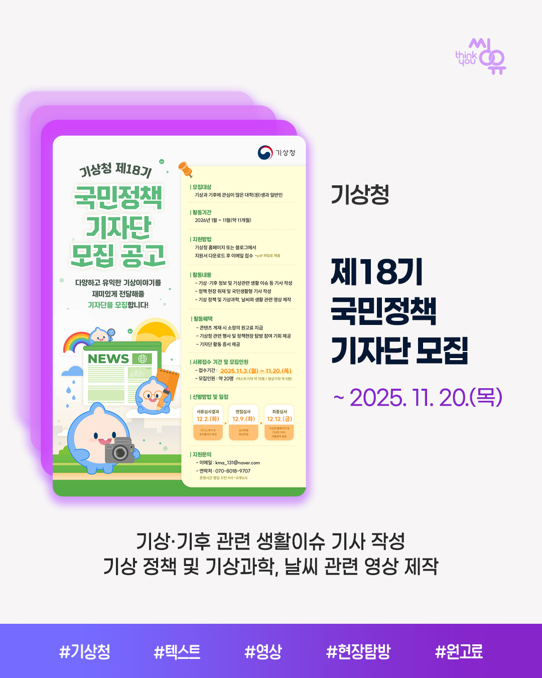 씽유 뉴스레터 신청을 위해 아래에 이메일 주소를 기입해주세요. 공모전 / 대외활동 / 이벤트 소식을 전달해드립니다.