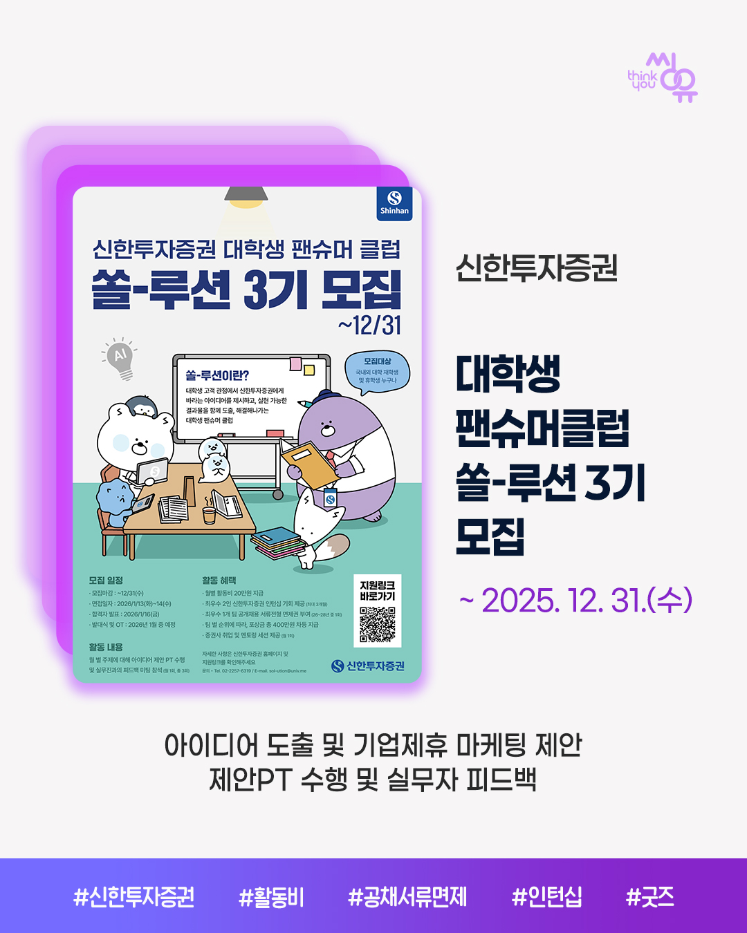 씽유 뉴스레터 신청을 위해 아래에 이메일 주소를 기입해주세요. 공모전 / 대외활동 / 이벤트 소식을 전달해드립니다.